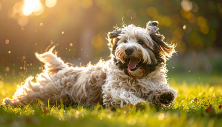 A shaggy, joyful dog tumbles through a lush green lawn, caught in a moment of pure bliss. The warm, golden light of the setting sun filters through the trees, creating a beautiful flare and highlighting the carefree energy of a perfect summer evening.