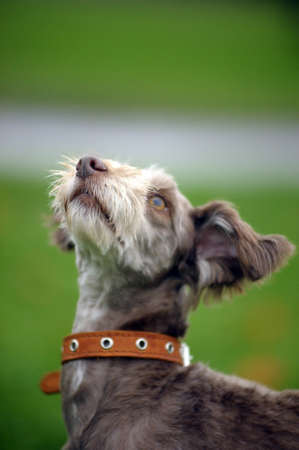 Close-up portrait of a cute dog in the garden. Dog looking at the camera.