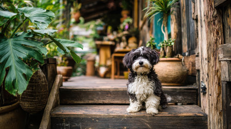 Adorable small dog sitting on wooden steps surrounded by lush greenery and potted plants in a cozy garden setting with rustic charm