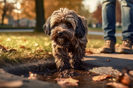 Cheerful pet dog stepping into a muddy puddle, bringing joyful chaos to a day at the park