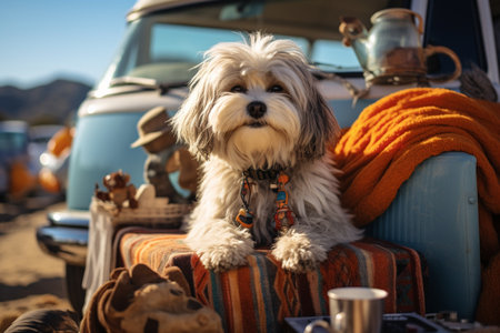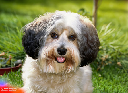 Adorable dog posing in a vibrant garden, wearing a floral bandana, enjoying a sunny day