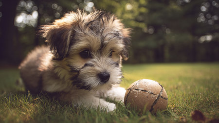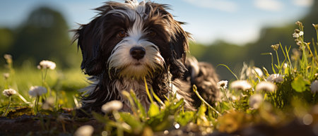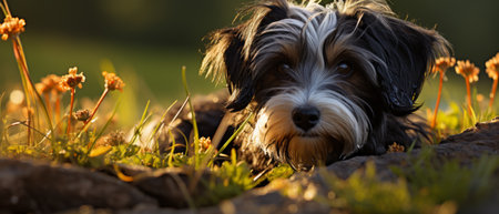 Capture the captivating charm of a golden hour encounter with this adorable close-up shot of a fluffy dog Resting serenely on lush green grass, the dog's soft fur glistens under the warm sunlight, casting a golden glow upon its sweet features Its playful expression and dreamy eyes invite viewers to engage with its undeniable cuteness, making this image perfect for pet lovers, animal enthusiasts, and anyone seeking a touch of joy and warmth AI Generative