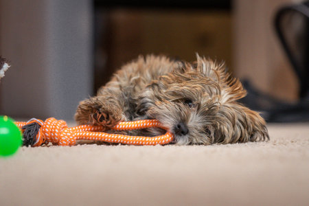 Adorable cute puppy playing with chew toy in apartment. Havanese Yorkshire mixed breed dog puppy