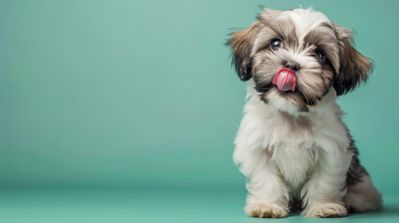 A funny and hungry Shih Tzu puppy dog eating and licking its lips with tongue. Isolated on a mint green pastel background.