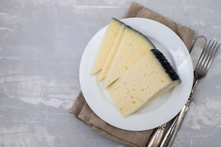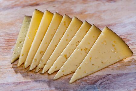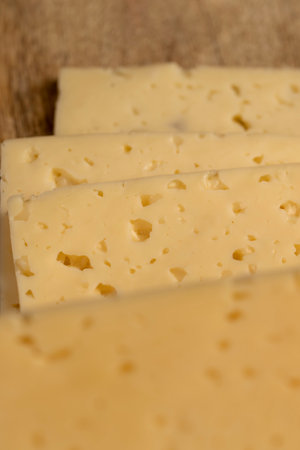 sliced natural cow's milk cheese, fresh yellow milk cheese on a board
