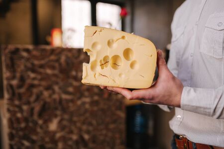 Hansome man hold big slice of cheese maasdam in hand. Cheese with big holes. Background of shelves with cheese