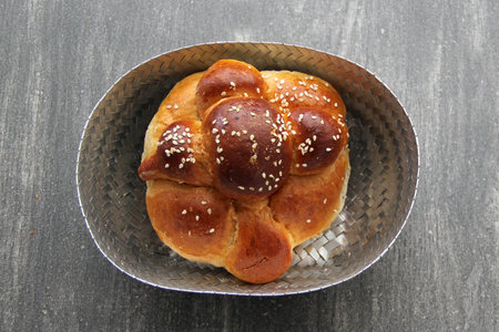 overhead shot of round challah bread on a silver tray, created with generative ai