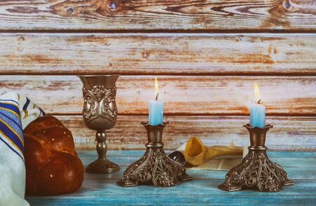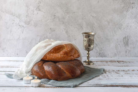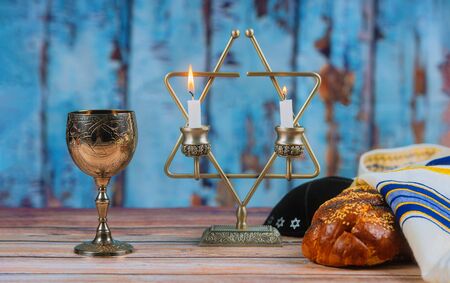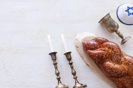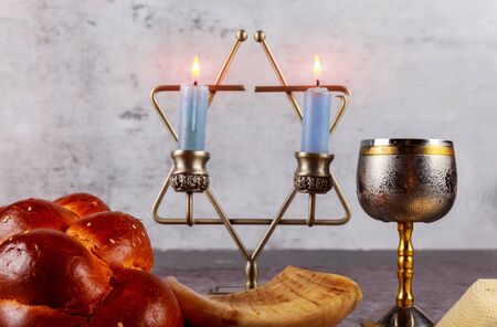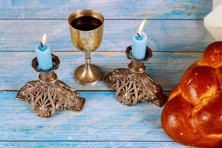 Shabbat Jewish holiday with challah bread on a candles and cup of wine.