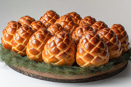 Christmas buns in the shape of a pine cone in on a wooden trading tray on a white background. Baked buns marketing.