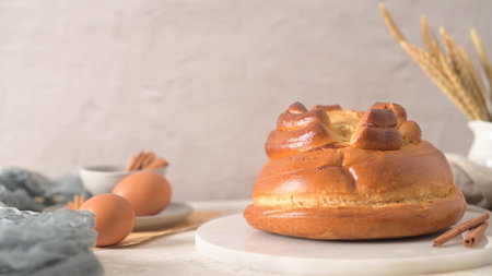 Easter sweet bread, cozonac or tsoureki on wood, close up view. Braided brioche, festive traditional dessert