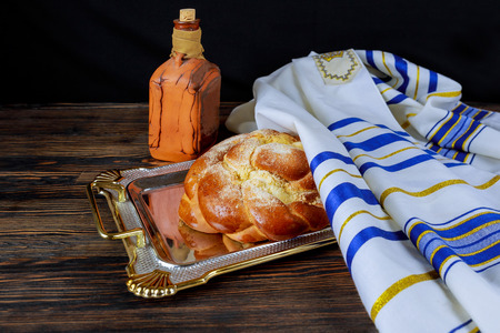 Sabbath essence homemade challah bread, kosher wine, candles, jewish holiday spirit