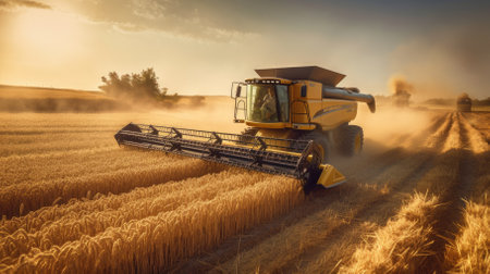 A combine harvester operates in a field of wheat under a dramatic sunset. The agricultural machine is central, showcasing its mechanics and function. Warm colors, including orange and gold, create a visually appealing scene. Ideal for illustrating farming, agriculture, or environmental themes in various media.