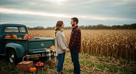 Young couple in plaid shirts holding hands while standing in front of an old truck with a basket of vegetables