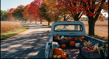Vintage pickup truck with pumpkins on a country road in autumn