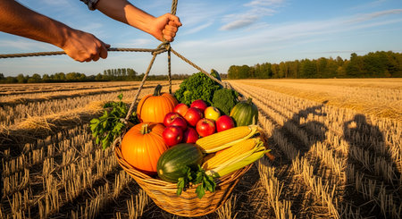 A wicker basket filled with autumn produce, including pumpkins, apples, and corn, is pulled by a rope across a harvested field. The golden sunlight highlights the abundance and freshness of the fall harvest.