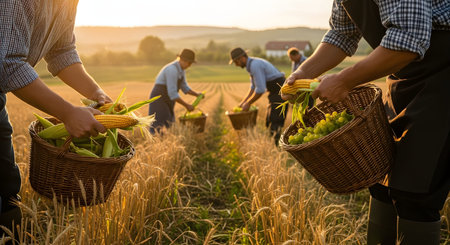 A group of farmers works in a golden field at sunset, carrying woven baskets filled with harvested corn and grapes. The image represents the diversity of agricultural produce and the hard work of the harvest season.