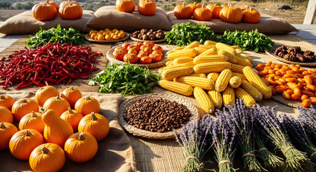 A rich and colorful display of autumn harvest produce arranged on mats and burlap. The composition includes piles of yellow corn, red chili peppers, small pumpkins, and bundles of lavender, showcasing agricultural abundance and variety.