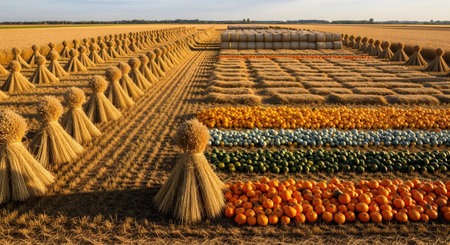 An artistic agricultural landscape featuring neat rows of wheat sheaves, rectangular hay bales, and sorted pumpkins. The symmetrical arrangement highlights the geometric patterns of farming harvest in a vast golden field.