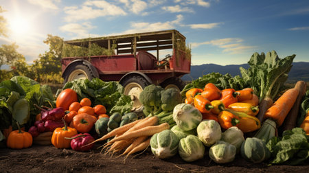 A vintage truck travels through a sunlit field, carrying an assortment of fresh vegetablesThe image captures the transportation of produce against a stunning sunset, conveying the idea of food distribution and cargo transport.