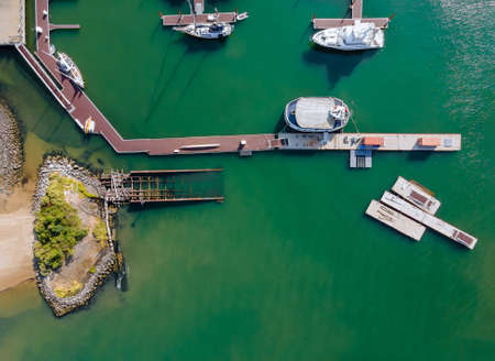 Yacht club aerial view. Aerial top-down view of docked sailboats. Top down view of yachts