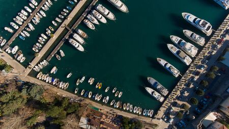 Aerial top view of boats and yachts in modern marina from above, Mediterranean sea, South France