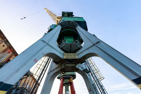Gdynia, Pomorskie / Poland - October, 25, 2020: Old port with cranes for transshipment. Place for unloading sea vessels. Autumn season.