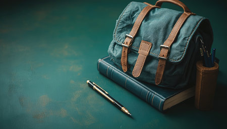 A vintage blue backpack, a leather-bound book, and a pen on a green surface.
