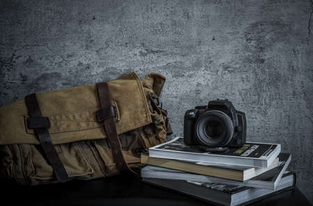South Tangerang / Indonesia - May 23, 2020: Digital camera on the book with messenger bag at home