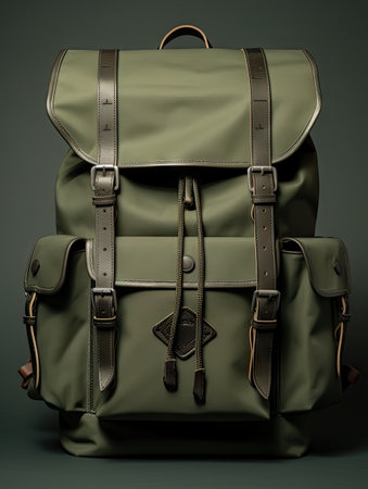an olive green backpack with brown leather straps and two buckles on the front, sitting against a dark grey background
