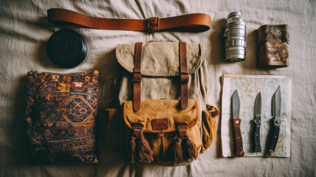 A collection of vintage-style survival gear, including a backpack, knives, and a belt, arranged neatly on a textured surface.