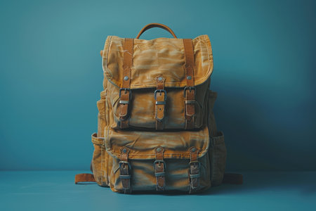 A tan canvas backpack with leather straps hangs against a minimalist background, symbolizing travel and adventure.