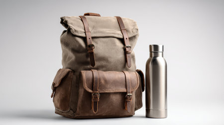 Vintage backpack, brown leather straps, and stainless steel water bottle on white background, travel and adventure concept