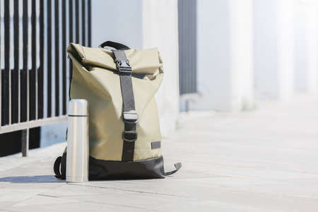 Hipster backpack closeup. View from front tourist traveler bag on urban background.