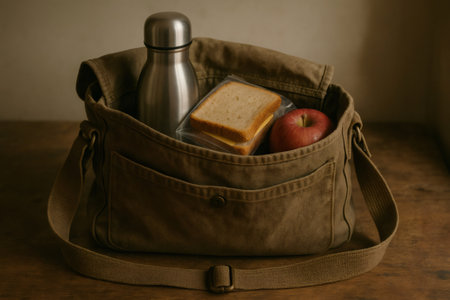 Canvas messenger bag holding a reusable water bottle, cheese sandwich, and fresh apple, ready for a healthy meal