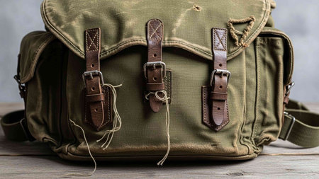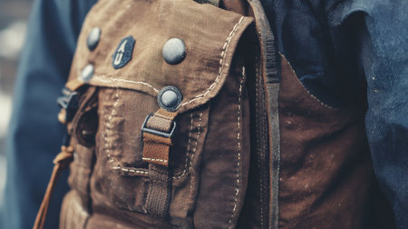 This detailed view captures the texture and design of a well-used leather backpack, featuring metal buttons and rugged fabric, nestled in a peaceful outdoor environment.