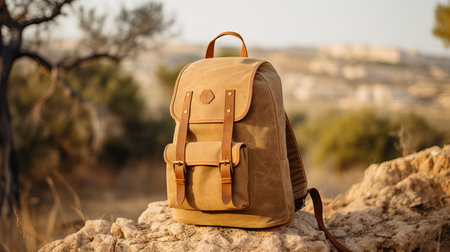 Under the soft glow of sunset, a classic canvas backpack rests on a rocky surface. The warm tones of the backpack blend harmoniously with the tranquil natural surroundings, inviting adventure.