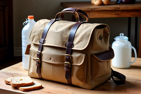Hiking backpack on a wooden table with bread and milk in the kitchen