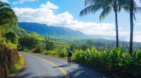 A cyclist explores a picturesque coastal road surrounded by lush greenery and stunning mountains, capturing the essence of adventure and nature's beauty.