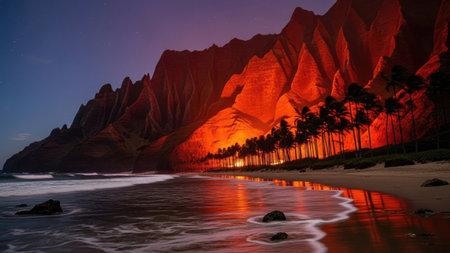 A striking visual features towering mountains bathed in warm, orange light. A line of palm trees borders the shoreline, reflecting in the wet sand. The scene is set during twilight, with a dark blue sky above. This image could be suitable for travel publications or environmental campaigns.