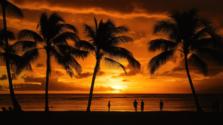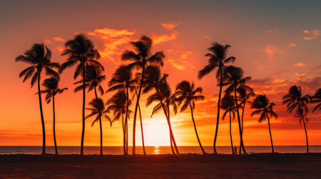 Stunning Hawaii ocean sunset with silhouettes of palm trees swaying against a vibrant sky of orange, pink, and purple hues, reflecting on calm tropical waters