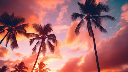 A stunning sunset casts vibrant colors across the sky, silhouetting palm trees against the tranquil ocean. Perfect for travel or nature themes.