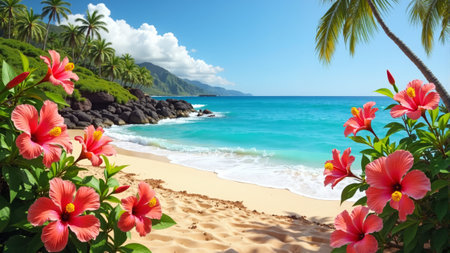 A stunning hibiscus flower bursts with color at the shoreline, where gentle waves kiss the sandy beach, framed by towering mountains and a bright blue sky on a perfect Hawaiian day.