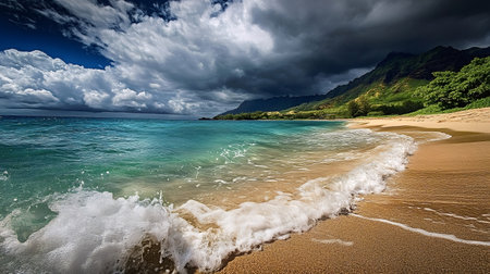 Gentle waves are washing onto a beautiful Hawaiian beach, with turquoise water, white sand, green mountains, and a dramatic cloudy sky creating a picturesque tropical paradise