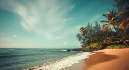 Tranquil scene of palm trees and waves at Caribbean waters edge generated by artificial intelligence