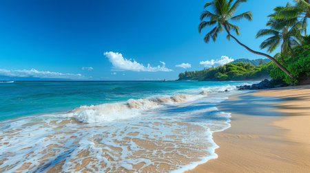 A serene tropical beach scene with palm trees leaning over golden sand and gentle waves lapping shore under clear blue sky. distant mountains add to tranquil atmosphere