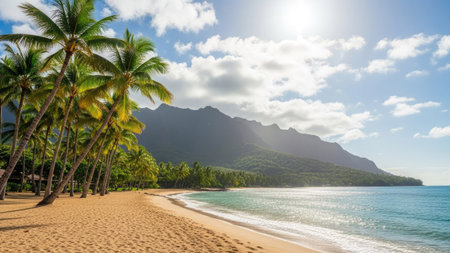 Experience a tranquil tropical paradise with palm trees swaying gently in the breeze, framed by majestic mountains and warm golden sunlight.