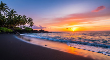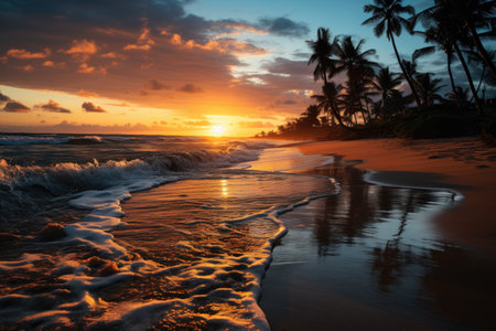 Experience the serene beauty of a tropical beach at sunset, where palm trees sway gently in the breeze and gentle waves caress the shore.