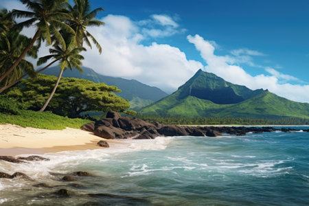 Landscape tranquil beach. Hawaii background, tropical Hawaiian paradise with palm.