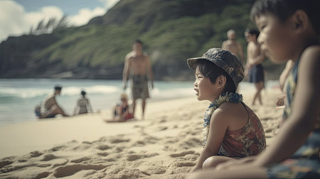 Illustration of a Hawaiian family playing on the beach