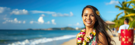 Happy tourist wearing traditional Hawaiian flower crown and lei, enjoying her vacation in a tropical paradise